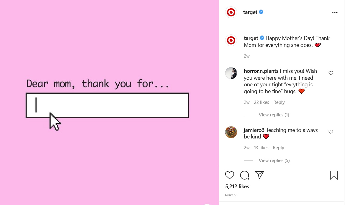 You can also link your Instagram account to your Facebook account. This will give you the option of sharing your Instagram posts directly to Facebook every time you post. Target used this strategy to maximize the impact of their recent Mother’s Day posts.