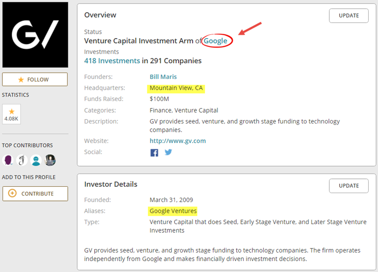 Here is GV’s own entry in Crunchbase. Note the furthest possible departure from commonly-known logo and color scheme, retaining only the iconic G.